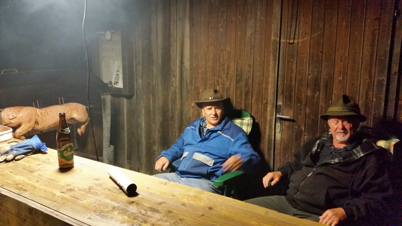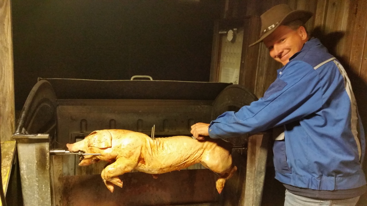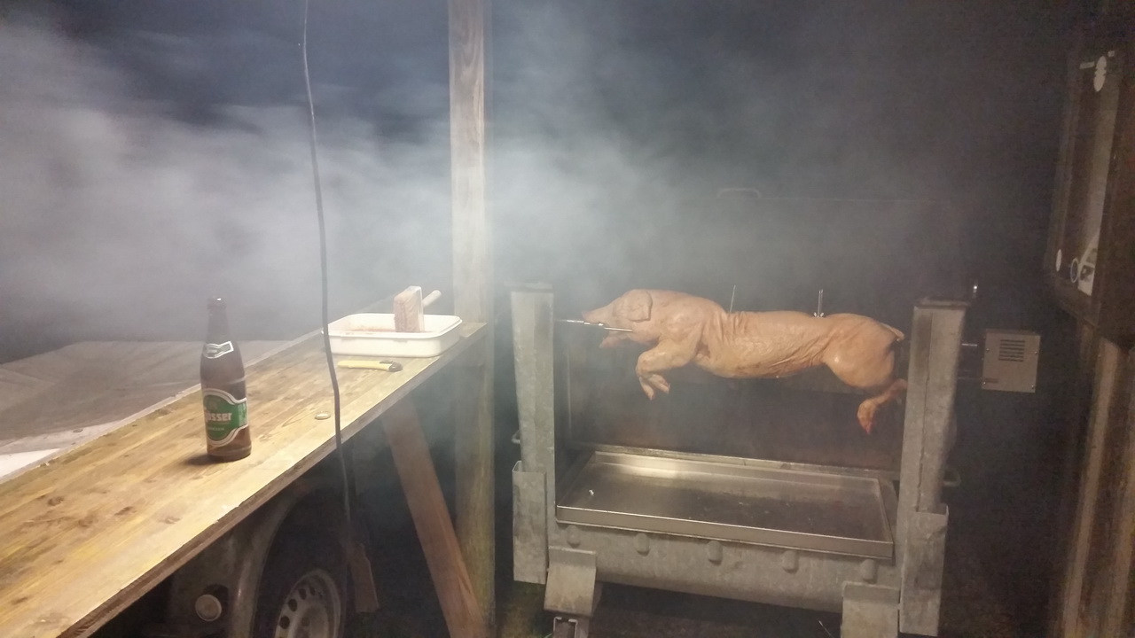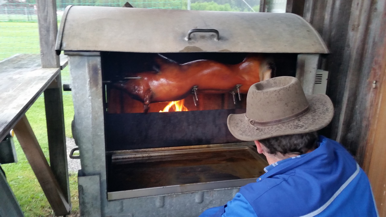 Unter fachmänischer Leitung von Karl Schnitzhofer wurde ab 02:00 Uhr Früh das 24 Kilo schwere Jungschweinerne auf seinem selbst konstruierten Griller gut 10 Stunden gegart.